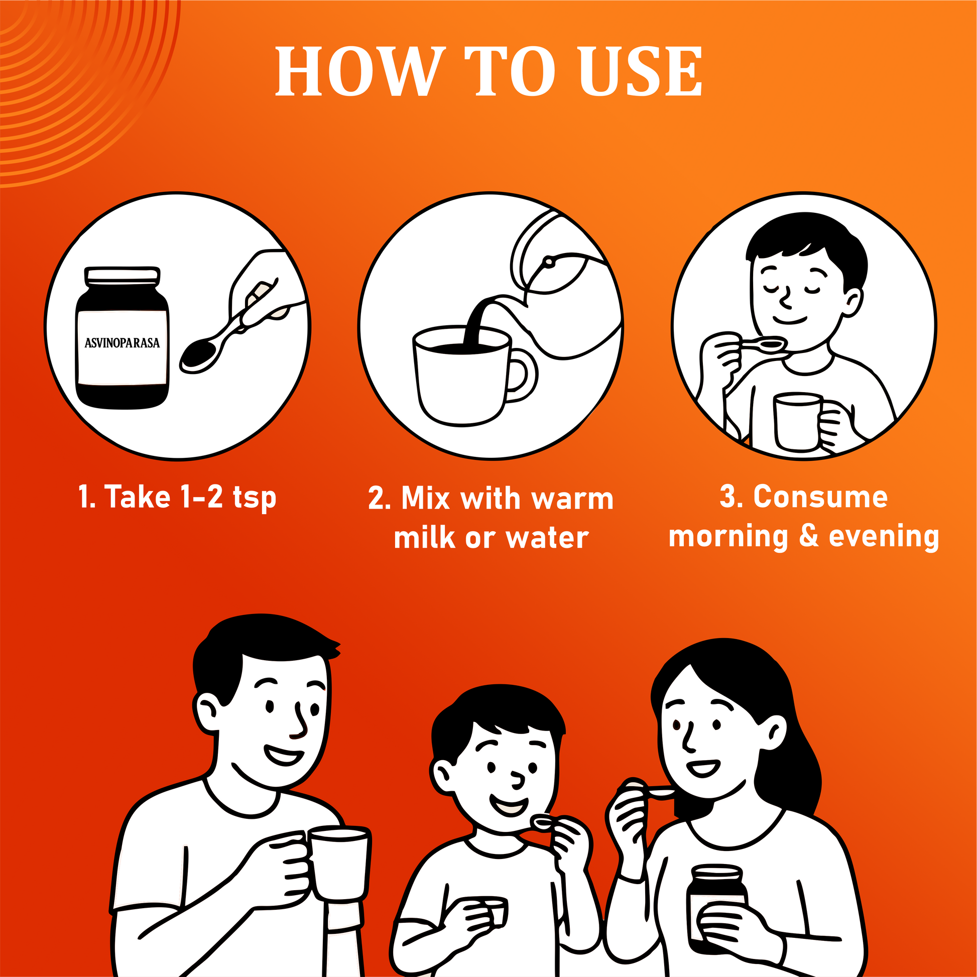 ✅ Enjoy Asvinoparasa by taking 1-2 teaspoons daily, either on its own or mixed with warm milk or water. For a refreshing start to your day, it’s best consumed in the morning. Children can enjoy half a teaspoon daily.